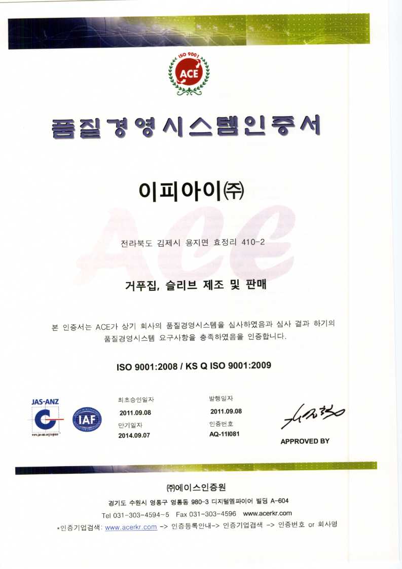 종이거푸집 ISO인증서 입니다.