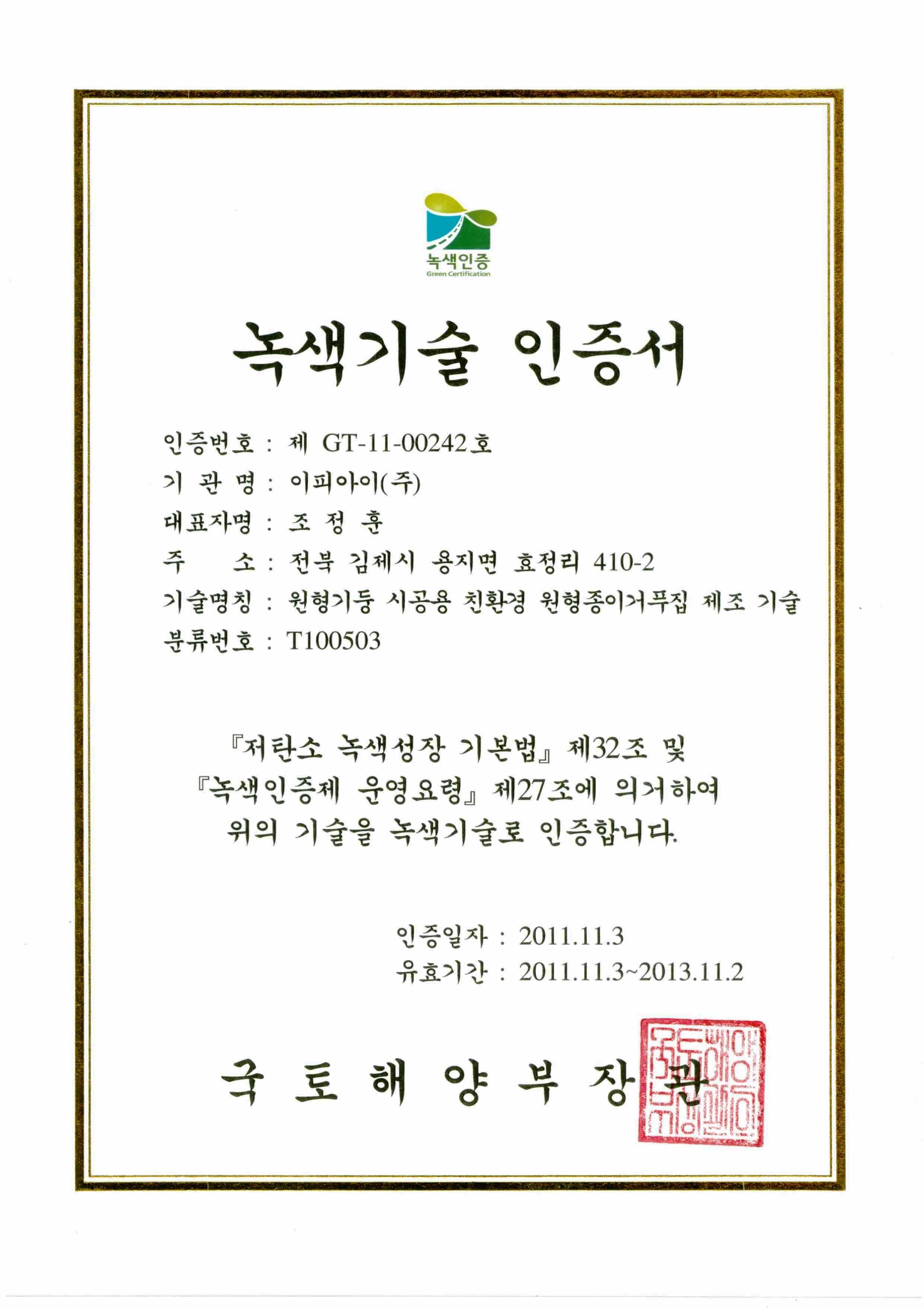 녹색기술인증 1점 대상 항목에 해당되는 기술인증서입니다.