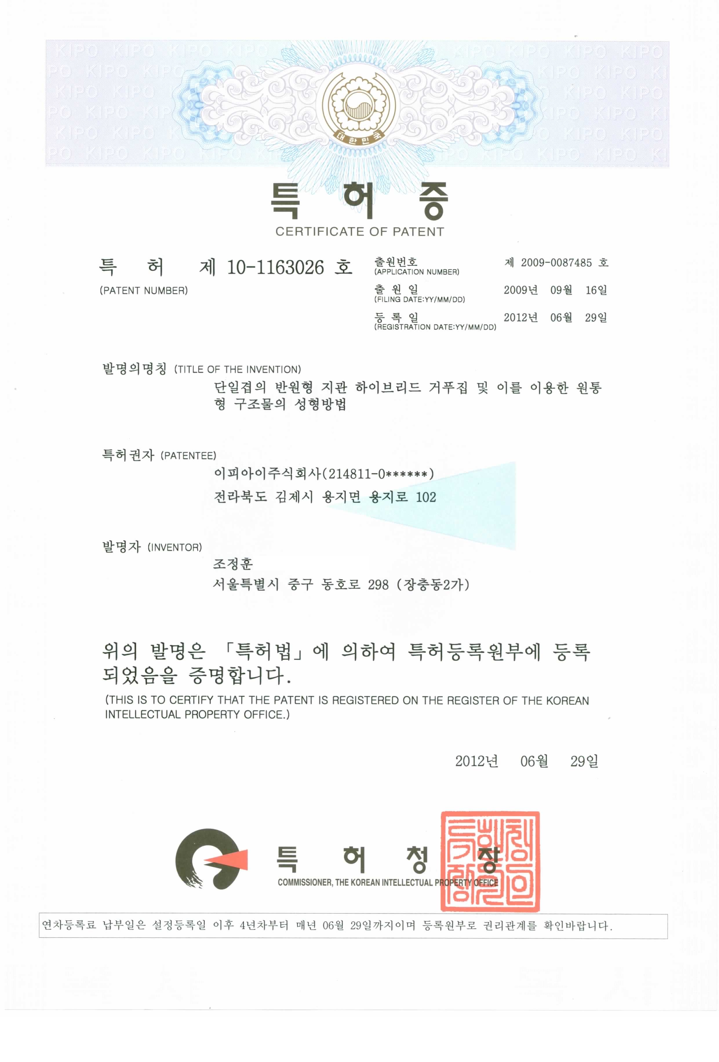 단일겹 하이브리드 종이거푸집 특허증 입니다.